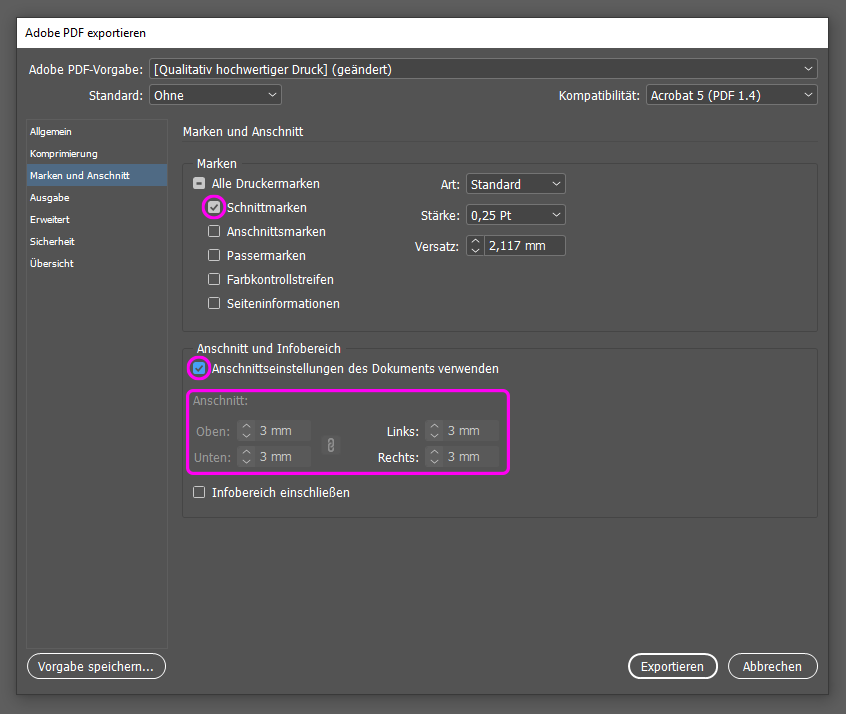 Wichtig ist, dass man beim Export der Datei nicht vergisst, die Schnittmarken und den Beschnitt zu aktivieren.