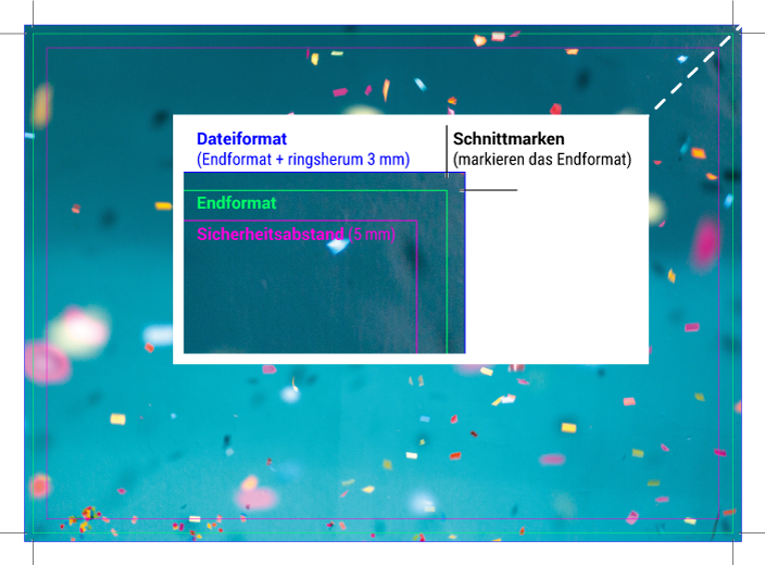 Der Beschnitt ist dann wichtig, wenn man ein Motiv drucken möchte, das randlose Inhalte darstellt. Hat man zum Beispiel einen Hintergrund oder Bilder, die exakt am Rand des Druckproduktes abschließen sollen, ist es unbedingt notwenig, die Datei ringsherum 3 mm erweitert anzulegen und die randlosen Inhalte überstehen zu lassen. Der einfache Grund dafür ist, dass ein Drucker nicht 100%ig genau arbeiten kann. Im Inneren des Druckers herrscht viel Bewegung und das zu bedruckende Papier muss einige Rollen durchlaufen. Hierbei kann schon ein minimaler Versatz zu unschönen Ergebnissen führen. Deshalb wird das Druckprodukt immer erst nach dem Druck zugeschnitten und so durch den zuvor gesetzten Anschnitt/Beschnitt vermieden, dass unschöne weiße Ränder entstehen.